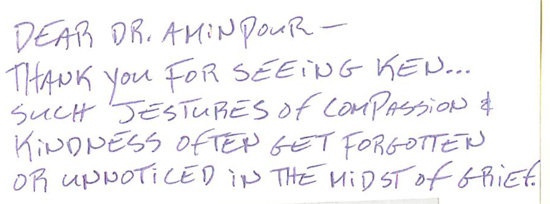 I am very grateful to his staff. My poor son had to see 4 Drs in less than 2 days and Dr. Aminpour stepped up to the plate. Thank you to his staff Sally, the front desk stafd as well as Dr. Aminpour for helping my son and just doing the right job with precision. Im very Thankful for his staff and looking forward to see how his wound heals. - MM
